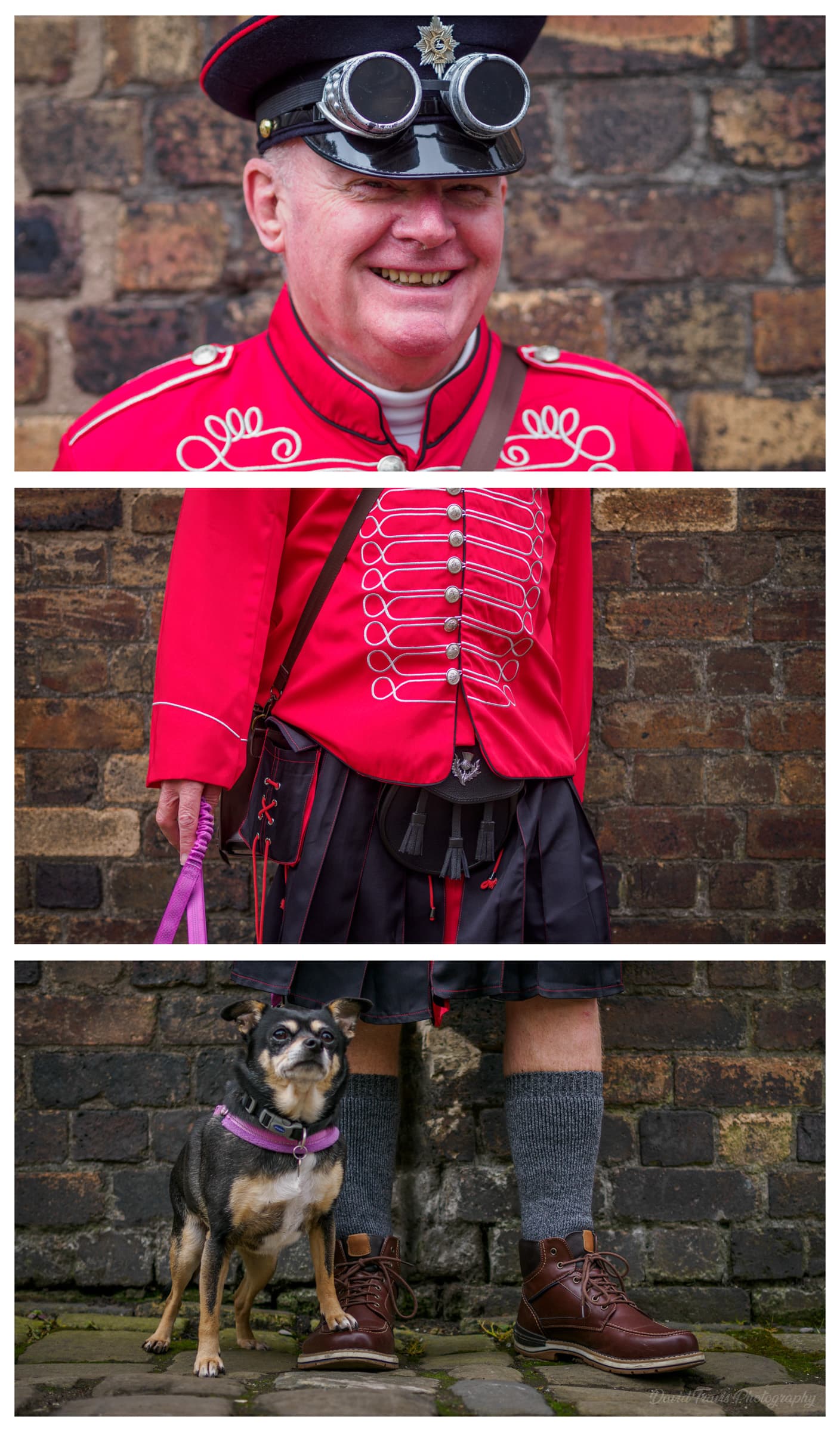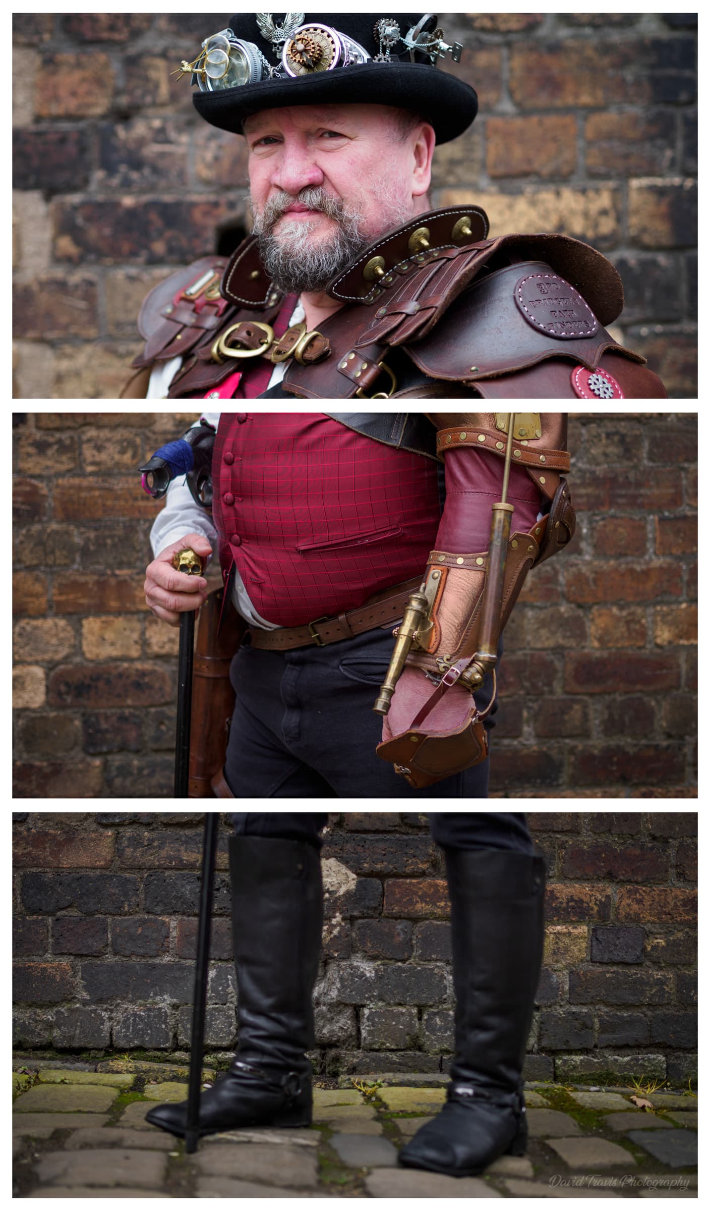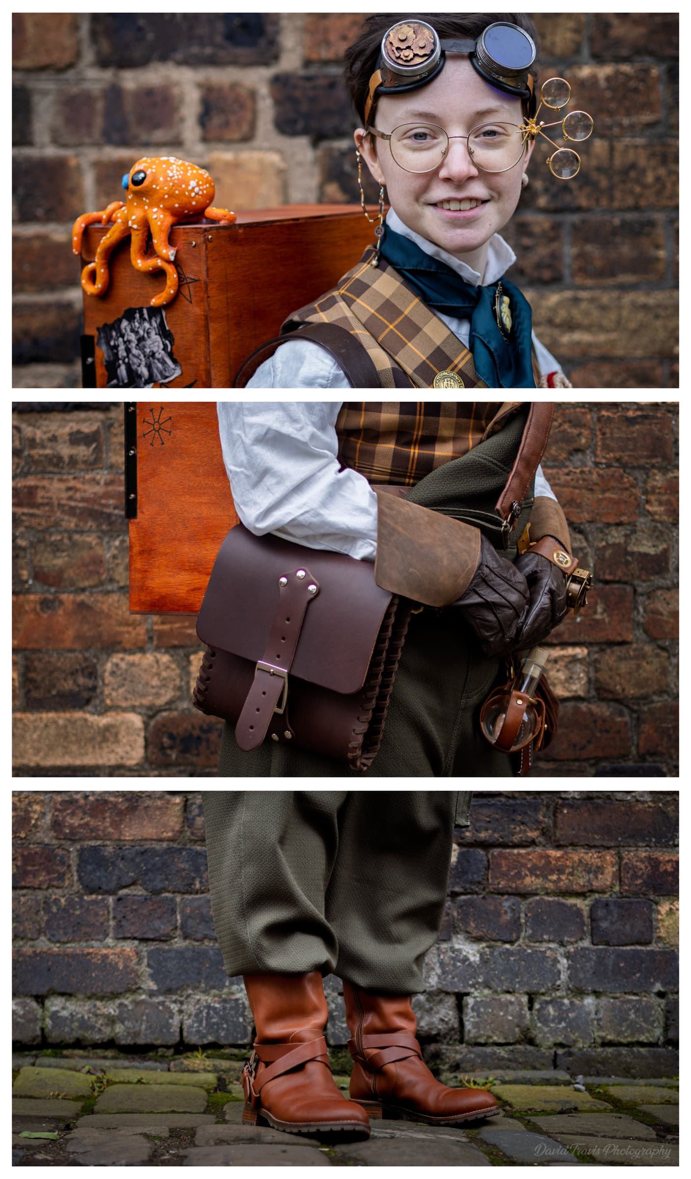 It also mirrors how these outfits are actually made. No one designs them from head to toe in one pass. They assemble components like goggles, fabrics, props and boots. The triptych echoes that process. It feels closer to an inventory than a portrait, which fits the maker culture behind steampunk.